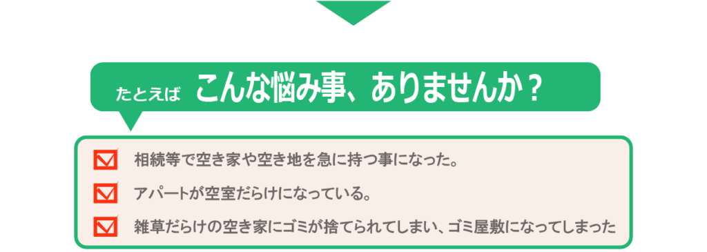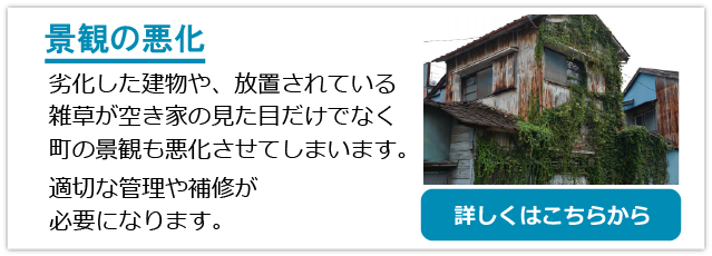 立木の腐朽、倒壊して敷地や道路に散乱している。空き家に住み着いた動物による騒音・臭気・羽などの発生により住民の日常生活の妨げになる状態等。