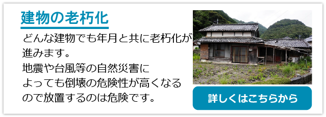 建物の倒壊、屋根や外壁の脱落、飛散する可能性がある状態。建物が大きく傾いている、沈下している、基礎や土台・柱の破損、腐食